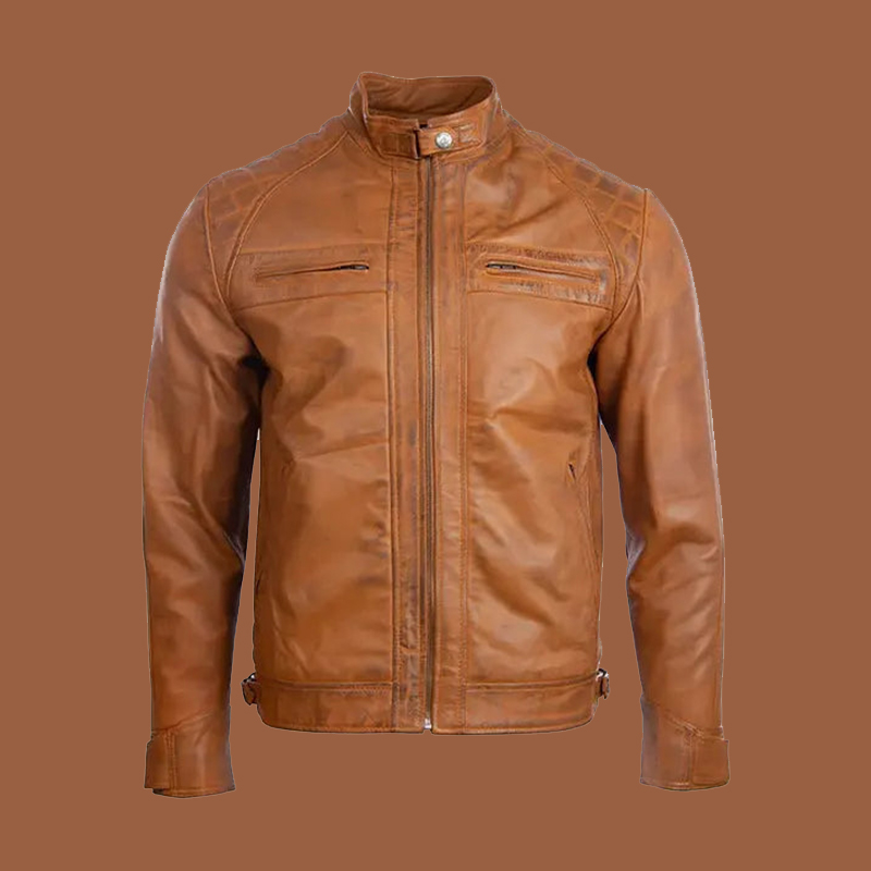 This jacket is crafted from high-quality genuine leather in a warm tan hue. It features quilted padding on the shoulders, a sleek band collar, and a front zip closure. The stitching is precise and durable, while the interior is lined for both comfort and structure. Metal hardware enhances the jacket’s premium build without overpowering its minimalist design.