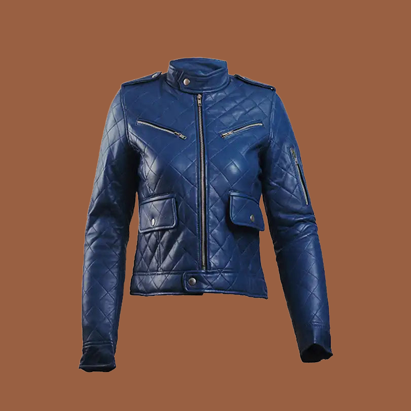 Women’s Short Quilted Shoulder Blue Leather Jacket