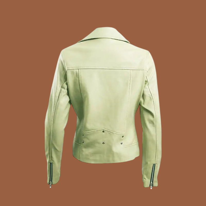 This jacket works equally well for rides, streetwear, or bold casual looks. Pair it with dark skinny jeans and boots for a strong biker aesthetic, or wear it over a dress to add a modern, edgy twist. The green leather elevates the design, making it a standout piece in any wardrobe.