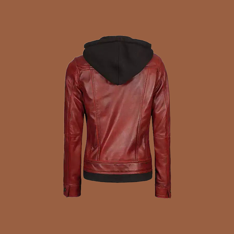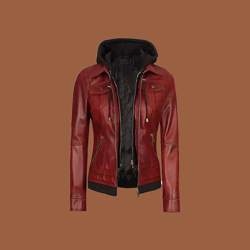 Be the first to review “Women’s Maroon Leather Jacket With Removable Hood”