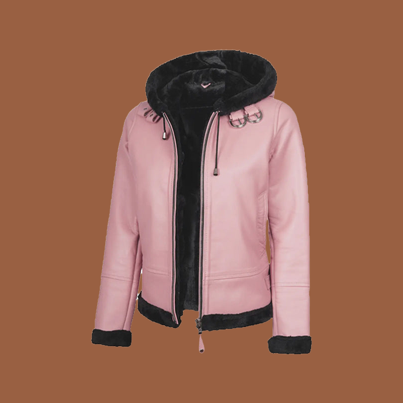 Women’s Pink Leather Hooded Shearling Jacket