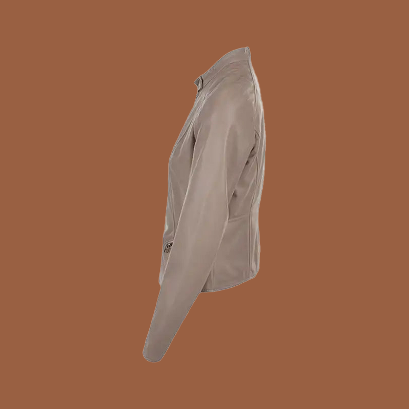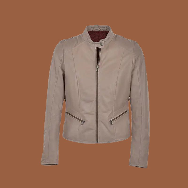 Crafted from genuine leather in a soft beige tone, this jacket features a streamlined moto silhouette with a stand‑up collar, front zipper closure, zip‑cuff sleeves, and clean panel detailing. Expert stitching and high‑quality hardware reflect its premium construction.