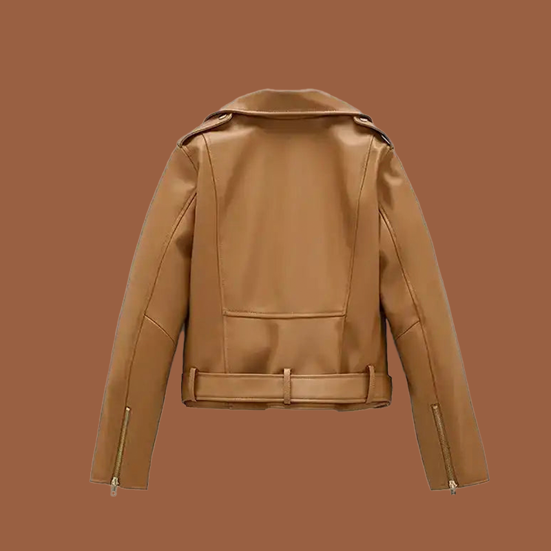 Be the first to review “Women’s Tan Brown Belted Moto Leather Jacket”