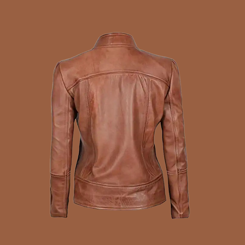 This café racer is perfect for pairing with jeans and boots for a laid-back, rider-inspired look. Alternatively, layer it over a dress to mix feminine softness with biker edge. The warm brown shade makes it a versatile staple that works across seasons.